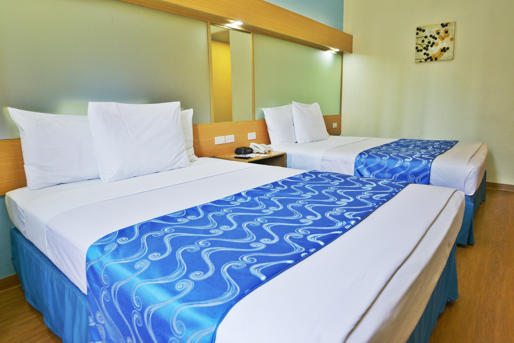 Two queen beds, airconditioned, non-smoking , window seat, wardrobe cabinet, desk with mirror and chairs, flat TV, luggage rack, personal refrigerator, ice bucket and pitcher set, toilet & bath with amenities, wifi access